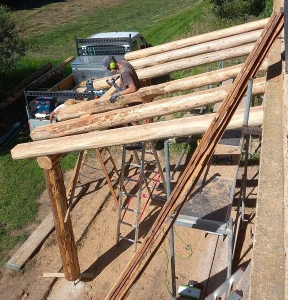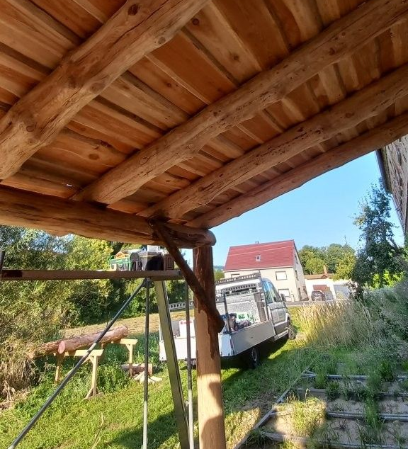 Am 13.08.2025 war der Bau der Holzkonstruktion der Überdachung abgeschlossen. Zunächst wurde das Holz mit einem Witterungsschutz behandelt.