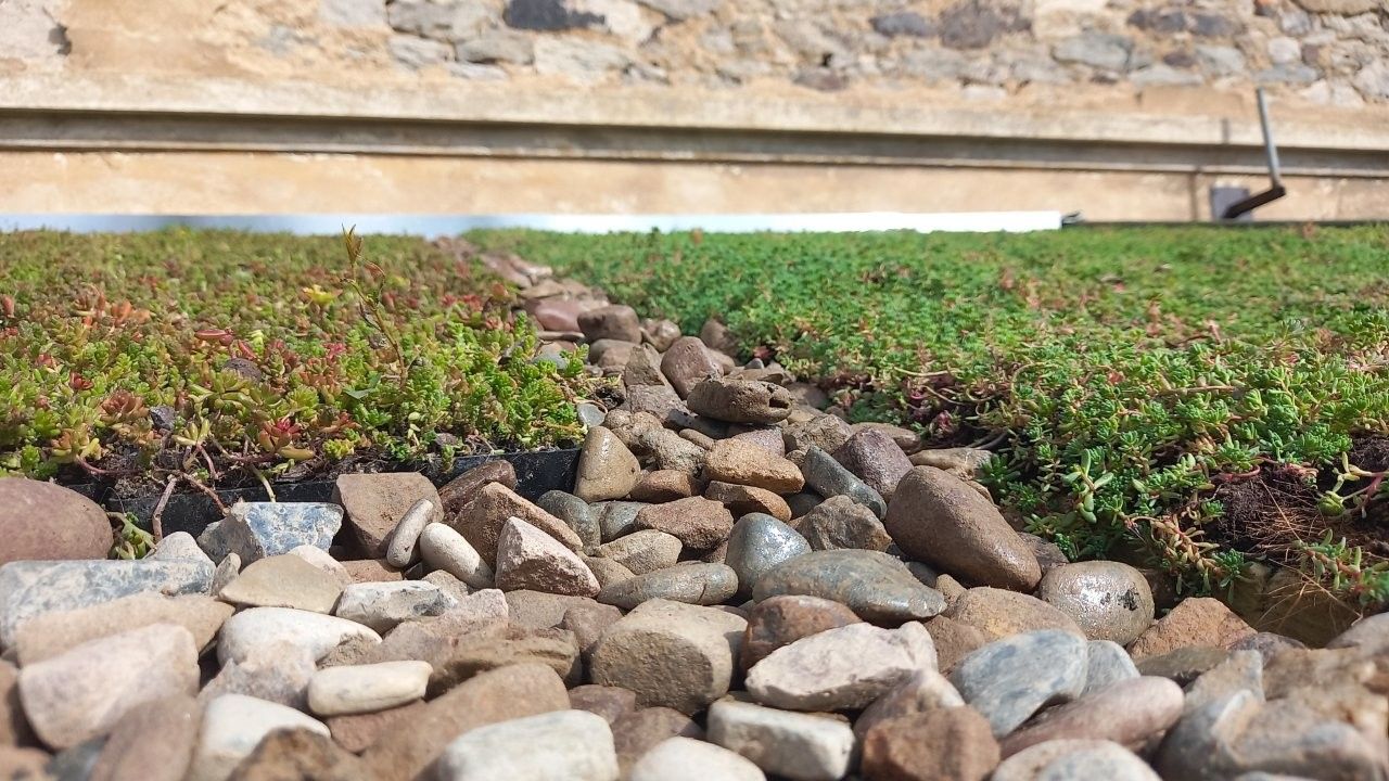 Am 17.09.2025 wurden für Vergleichszwecke zwei unterschiedliche Systeme der Dachbegrünung installiert. Dafür verwendeten wir auf der einen Hälfte fertig bepflanzte Sedumkasetten mit Click-system und auf der anderen Sedummatten zum Ausrollen mit darunterliegendem Mineralsubstrat sowie Drainage. Die Randbereiche und der Zwischenraum der Sedumflächen wurden mit Kies aufgefüllt.