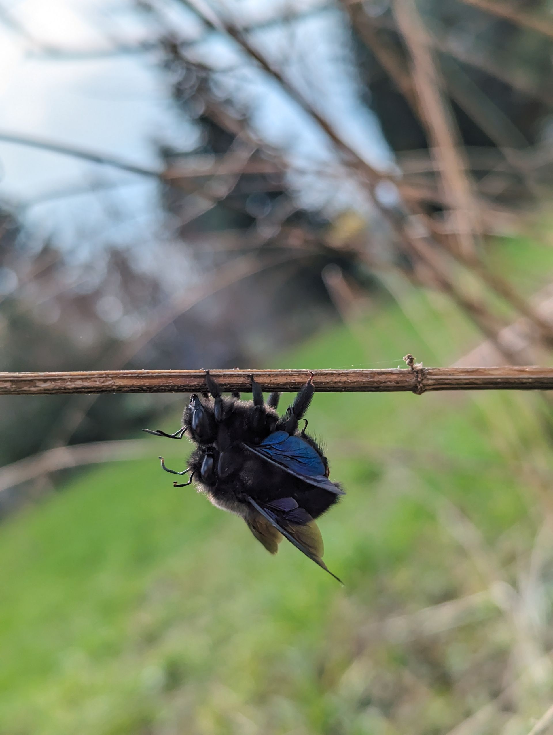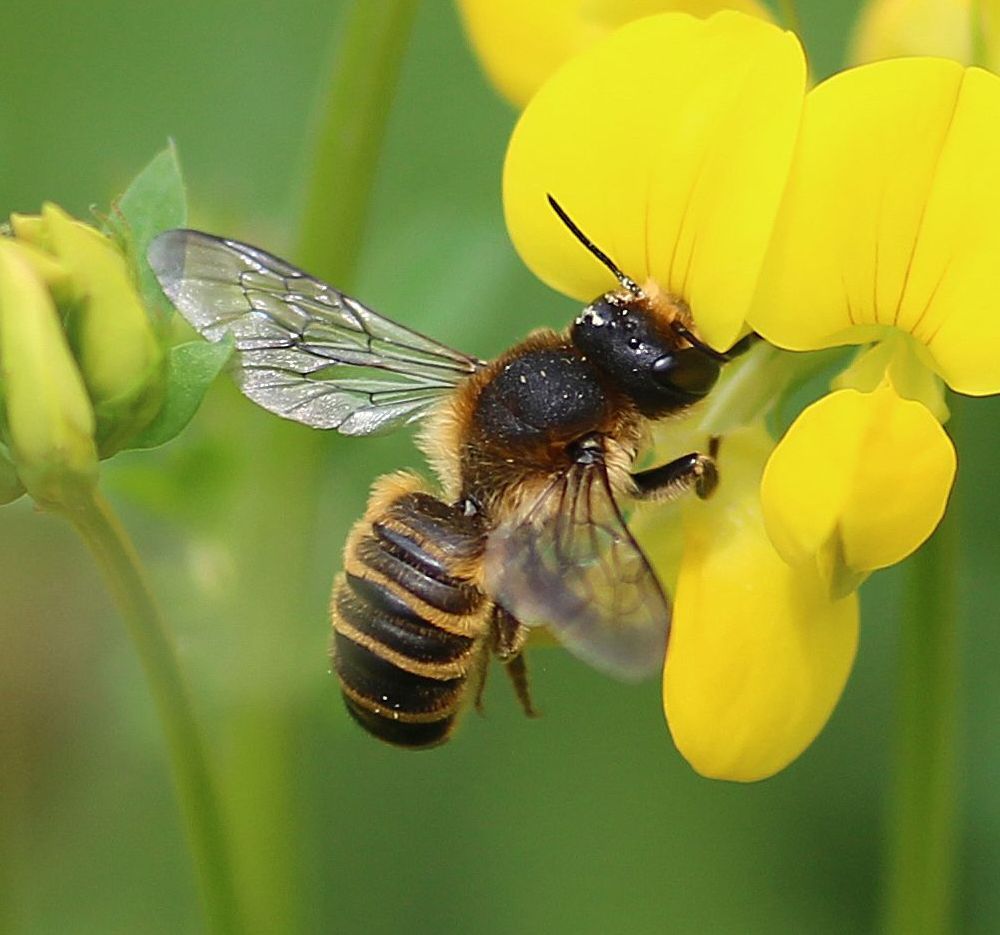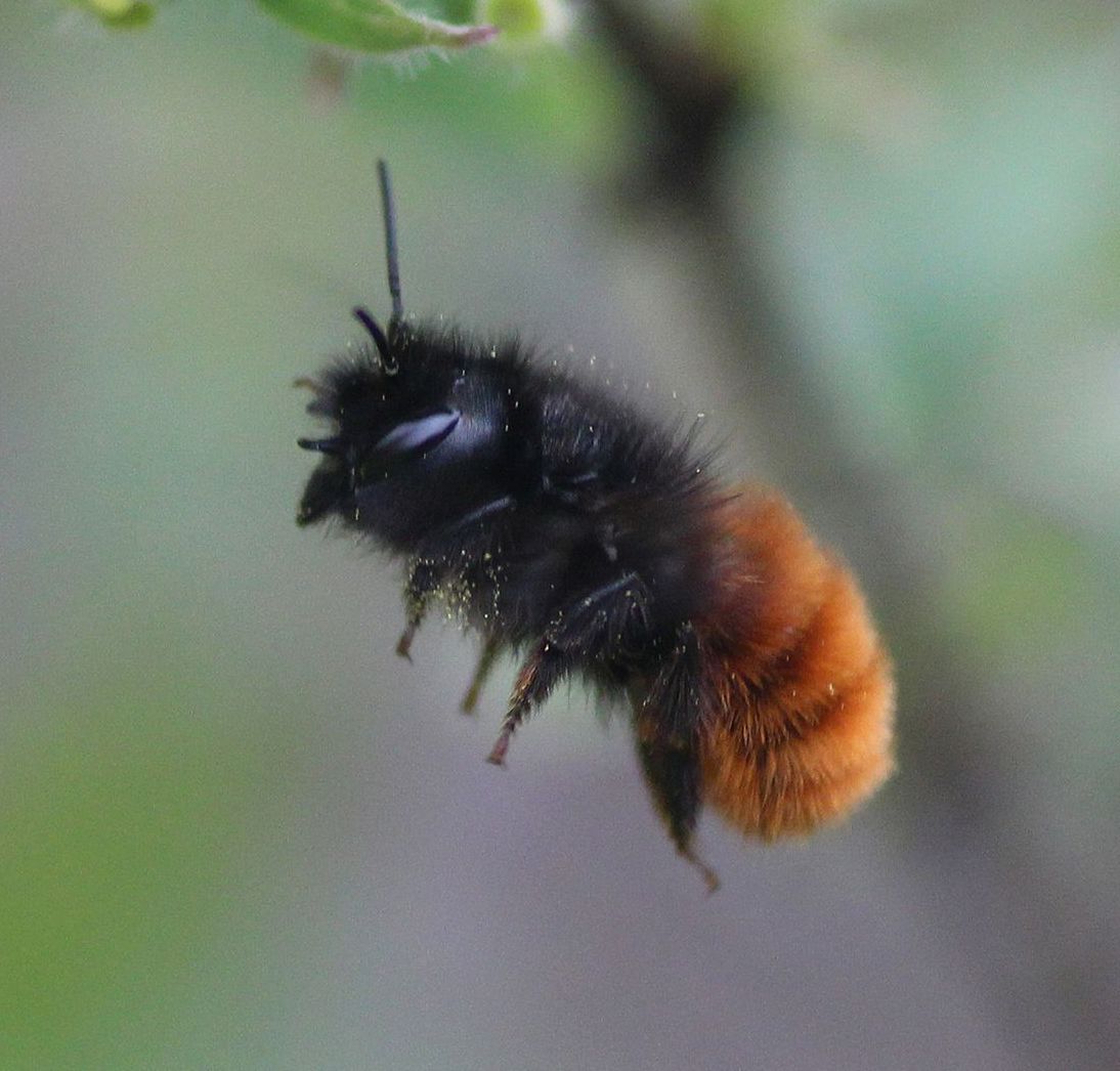 Zum Ende der Bauphase schwirrten bereits einige Wildbienen auf dem Vereinsgeländer umher. Sie nährten sich vom Nektar der Frühblüher, Sträucher und Bäume. Besonders viel Bewegung war direkt über dem Sandarium an der offenen, meist unverputzten Vereinswand mit Natursteinen unterwegs. An einem sonnigen Tag konnte diese ca. 1 cm große Wildbiene (Gemeine Trauerbiene, Melecta albifrons) entdeckt werden. Als Brutparasit bedient sie sich an der Arbeit anderer Wildbienen: kurz bevor der Wirt das Nest verschließt, legt sie ihre Eier dazu. Hierdurch spart sie sich die Arbeit bei Pollen sammeln (Verpflegung für die Nachkommen), muss aber lange warten und einen geschickten Moment abpassen um nicht aufzufliegen.
