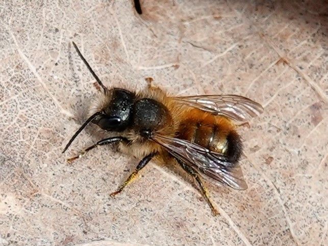Sandkörnern (also mineralisch). Wir gehen deshalb davon aus, dass sich hier entweder die Rote oder gehörnte Mauerbiene (Osmia bicornis oder cornuta) oder die Platterbsen-Mörtelbiene (Megachile ericetorum) angesiedelt haben.